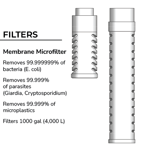 As you squeeze the bottle or take a sip, the advanced 2-stage filter automaticallypurifies the water. The membrane microfilter traps bacteria, parasites, and microplastics, while the activated carbon filter reduces chlorine, odors, and organic chemicals.